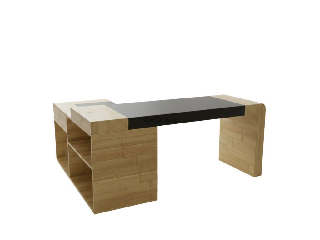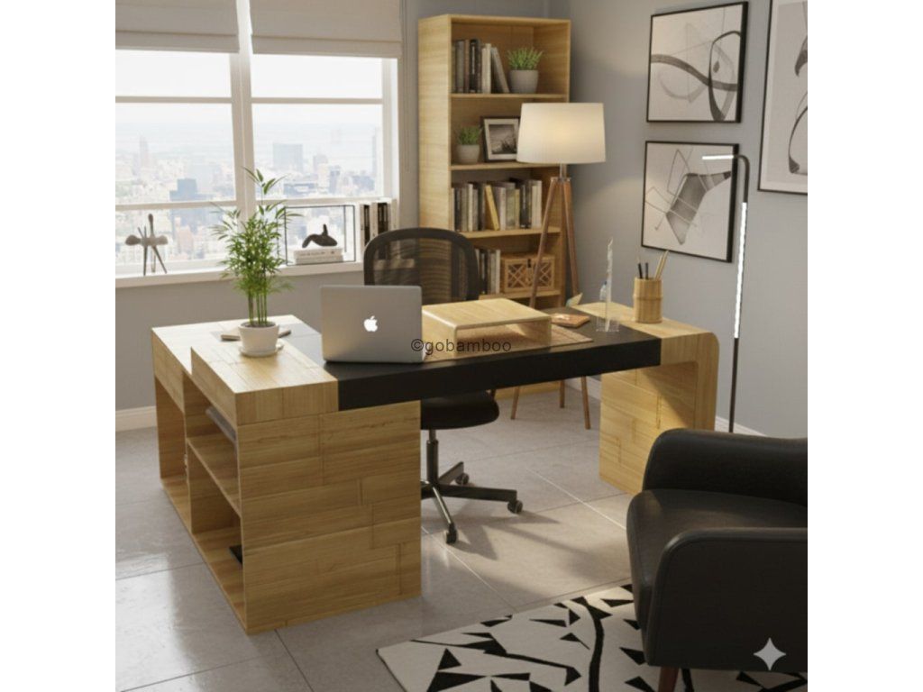 Konštrukcia z lisovaného bambusu prináša teplý, prírodný pocit, ktorý je sofistikovane doplnený tmavou, modernou pracovnou doskou. Jasná geometria línií a masívne prevedenie vyžarujú stabilitu a silu, no zároveň pôsobia vizuálne ľahko a vyvážene.