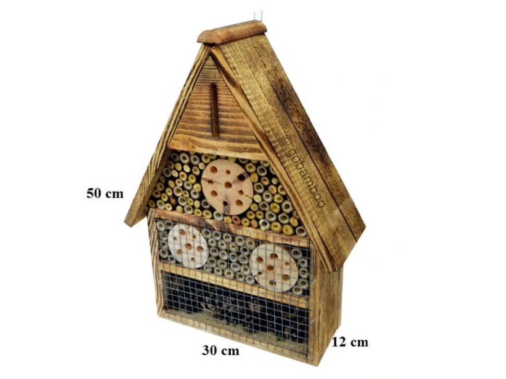 Domy sa skladajú z niekoľkých sekcií. Každý z nich je naplnený: kôrou, šiškami alebo machom a vyvŕtanými drevenými a bambusovými tyčami. To má do záhrady nalákať čo najviac hmyzu, ako sú motýle, čmeliaky, lienky a tiež včely. Hotely sú vybavené kovovým krúžkom, ktorý je potrebný k pripevneniu domu ku kmeňu stromu alebo k stene.