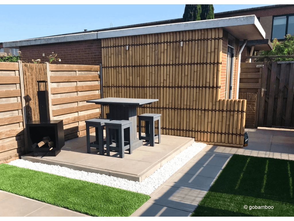 Polkruhové bambusové plotové panely sú špeciálne navrhnuté na inštaláciu k existujúcemu pletivovému oploteniu, drevenému plotu alebo k stene, a preto sú ľahké a lacnejšie ako štandardný bambusový plot z celých bambusových tyčí.