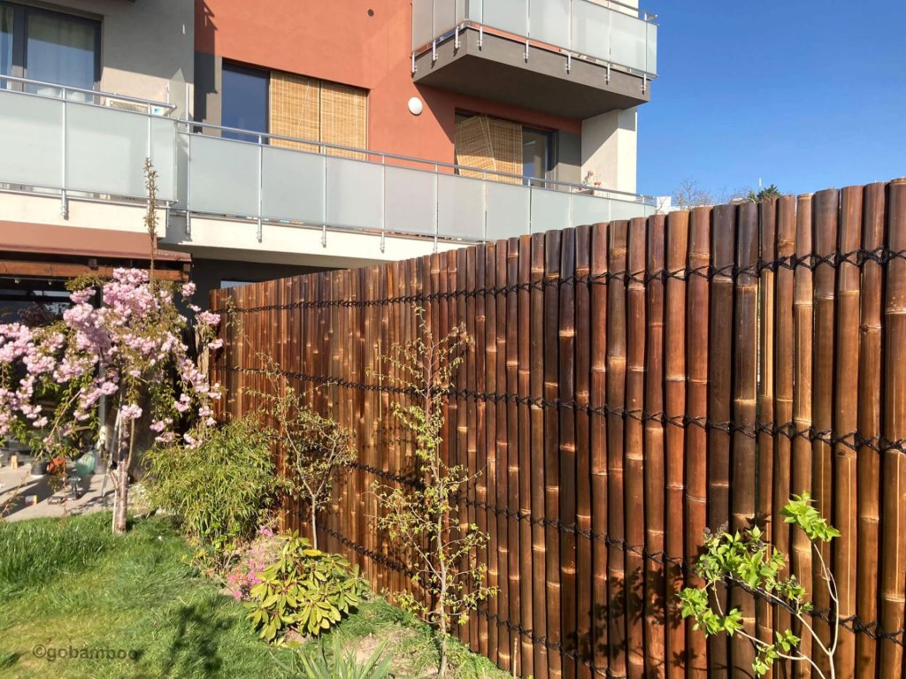 Polkruhový bambusový plot dodá vašej záhrade alebo terase krásny a exotický nádych. Polkruhové čierne bambusové tyče v týchto oploteniach majú priemer 6 až 9 cm a sú spojené bambusovými lamelami a prírodným čiernym lanom z kokosových vlákien, ktoré prechádzajú celou šírkou panelového plotu.