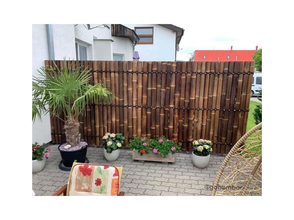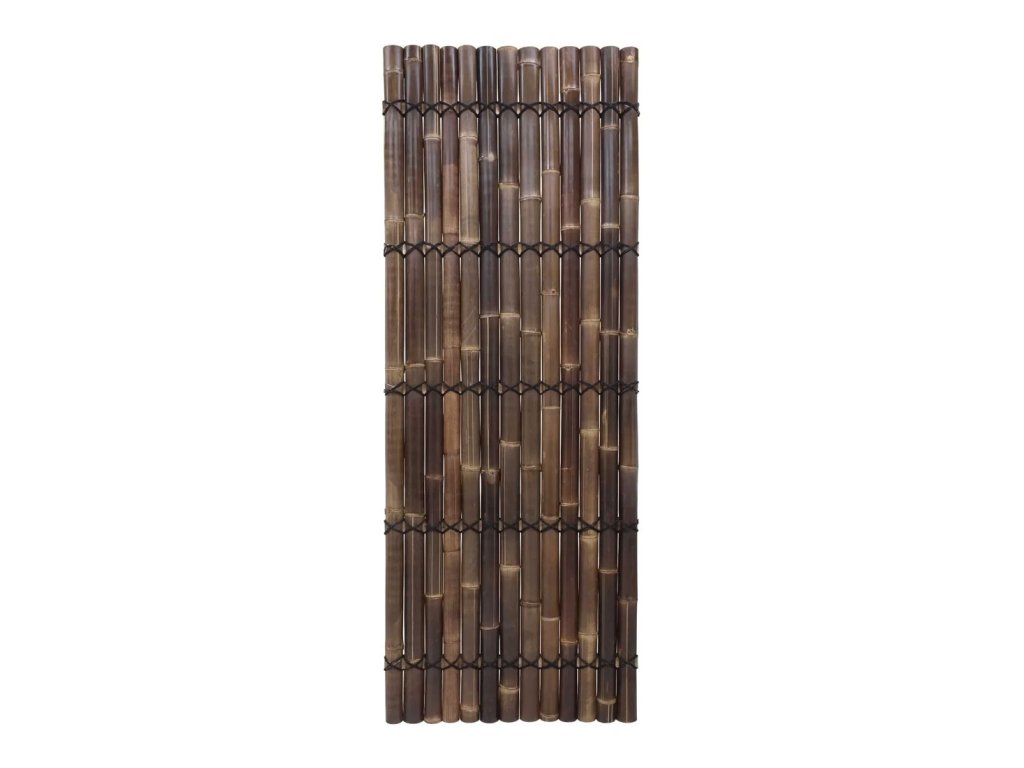 Polkruhový bambusový plot dodá vašej záhrade alebo terase krásny a exotický nádych. Polkruhové čierne bambusové tyče v týchto oploteniach majú priemer 6 až 9 cm a sú spojené bambusovými lamelami a prírodným čiernym lanom z kokosových vlákien, ktoré prechádzajú celou šírkou panelového plotu.