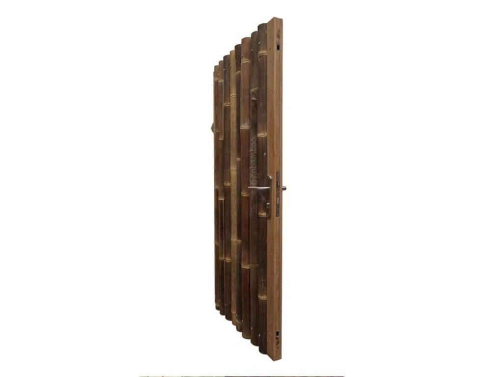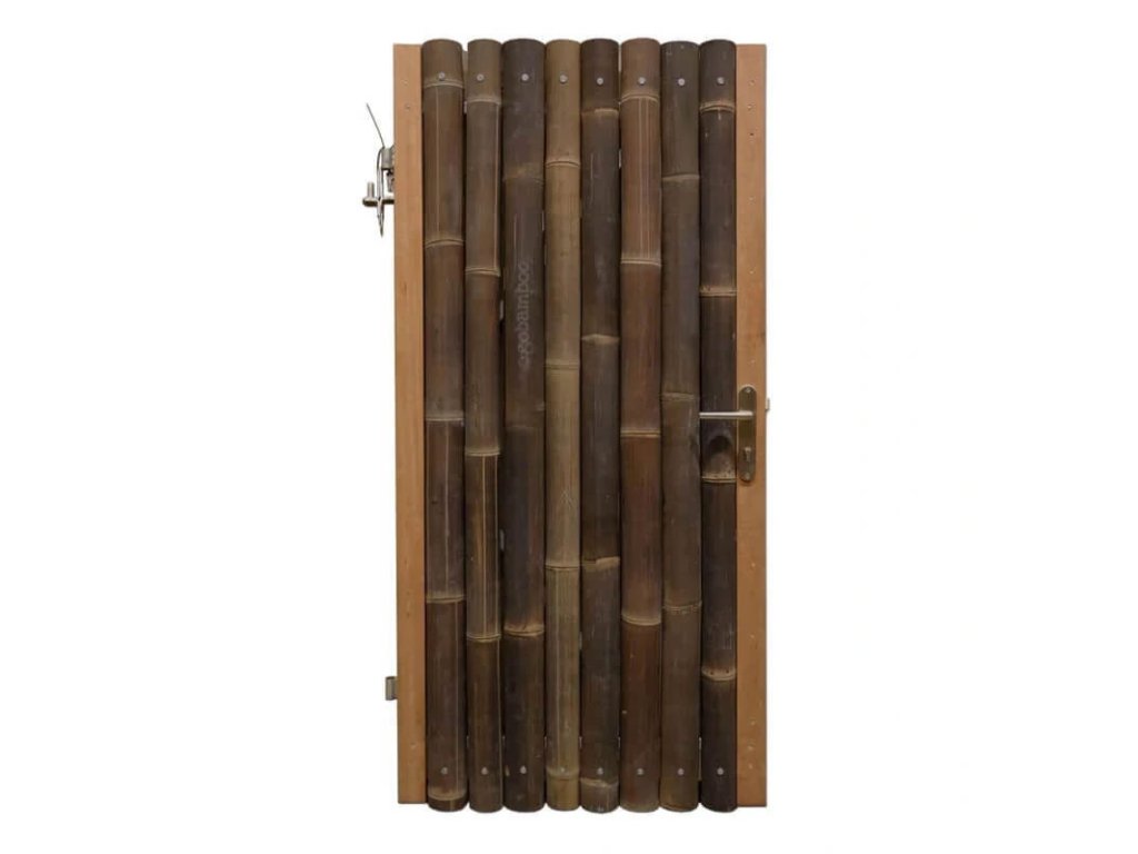 Táto obrovská bambusová brána so šírkou 100 cm a výškou 180 cm je má mimoriadne vysokú kvalitu. Základňa týchto dverí pozostáva z pozinkovaného oceľového rámu a boky sú pokryté doskami z tvrdého exotického dreva Azobe. Ponúkame možnosť voľby medzi ľavou alebo pravou bránou (na obrázku vidíte ľavú) . Obidve strany tejto bambusovej brány sú pokryté 6 až 8 cm širokými polkruhovými tyčami z bambusu Java Black. Celková hrúbka týchto bambusových dverí je asi 10 cm. Táto brána Gigant z bambusu Java je špeciálne navrhnutá tak, aby sa dokonale hodila v kombinácii s našimi panelovými plotmi z bambusu a prichádza s ťažkými pántmi, vrátane dverového zámku z nehrdzavejúcej ocele s kľúčom a západkou. Bambusová brána sa ľahko inštaluje medzi 2 stĺpiky z tvrdého dreva (objednáva sa osobitne).