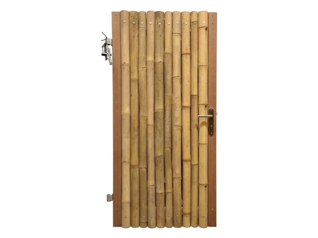 Táto obrovská bambusová brána so šírkou 100 cm a výškou 200 cm je vyrobená v Holandsku a má mimoriadne vysokú kvalitu. Základňa týchto dverí pozostáva z pozinkovaného oceľového rámu a boky sú pokryté doskami z tvrdého exotického dreva Azobe. Ponúkame možnosť voľby medzi ľavou alebo pravou bránou (na obrázku vidíte ľavú) . Obidve strany tejto bambusovej brány sú pokryté 6 až 8 cm širokými polkruhovými tyčami z bambusu Tali z Indonézie. Celková hrúbka týchto bambusových dverí je asi 10 cm. Táto brána Gigant z bambusu Tali je špeciálne navrhnutá tak, aby sa dokonale hodila v kombinácii s našimi panelovými plotmi z bambusu a prichádza s ťažkými pántmi, vrátane dverového zámku z nehrdzavejúcej ocele s kľúčom a západkou. Bambusová brána sa ľahko inštaluje medzi 2 stĺpiky z tvrdého dreva (objednáva sa osobitne).